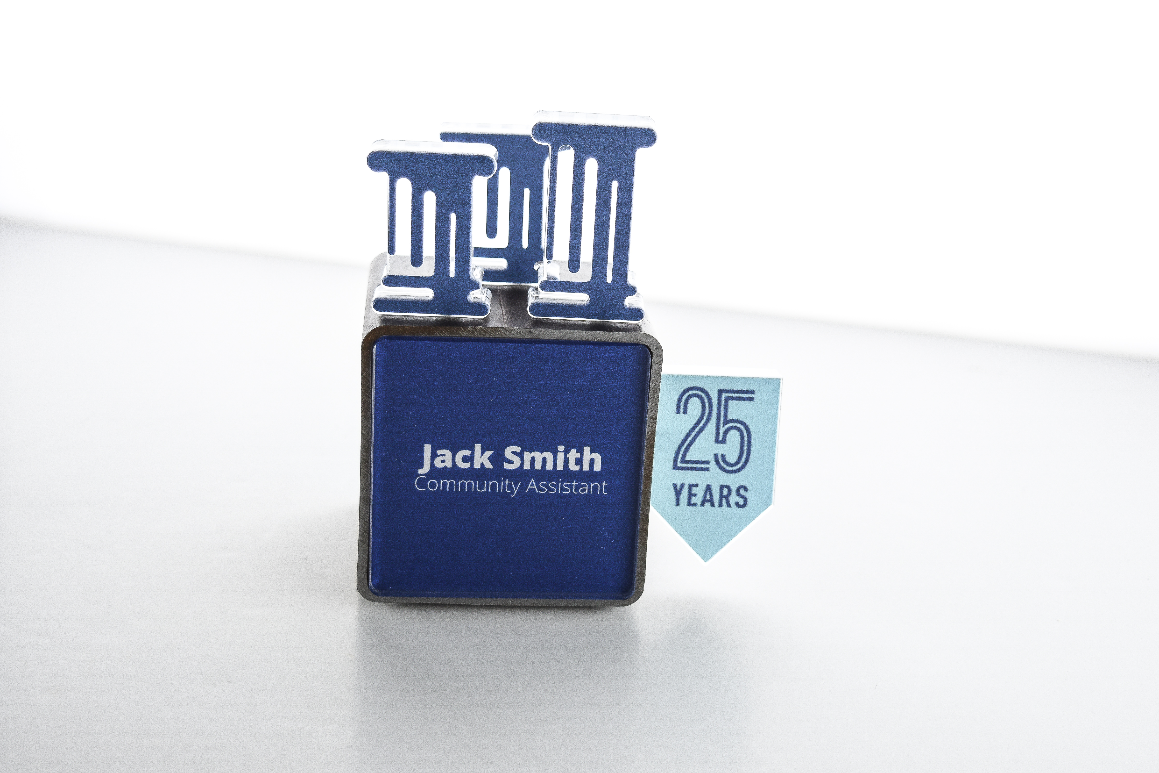 CUBED comes equipped with two acrylic face plates, front and back. Use this space to praise teams and individuals for their contributions and accomplishments... even doubles as a dry-erase whiteboard!